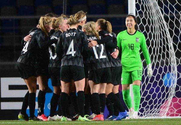 30일 경기도 고양종합운동장에서 열린 ‘신세계 이마트 초청 여자축구국가대표팀 친선경기’ 한국과 뉴질랜드의 경기에서 한국 김정미가 뉴질랜드에 선제골을 허용한 후 아쉬워하고 있다.