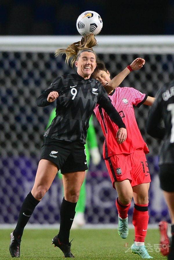 30일 경기도 고양종합운동장에서 열린 ‘신세계 이마트 초청 여자축구국가대표팀 친선경기’ 한국과 뉴질랜드의 경기에서 한국 박예은이 뉴질랜드 레니와 공중볼 경합을 벌이고 있다.