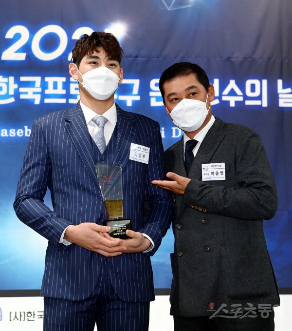 2일 서울 청담동 리베라호텔에서 ‘2021 한국프로야구 은퇴선수의 날’ 시상식에 참석한 키움 이정후가 최고의 선수상을 수상한 뒤 이종범 한은회 부회장과 기념촬영을 하고 있다.