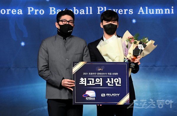 2일 서울 청담동 리베라호텔에서 ‘2021 한국프로야구 은퇴선수의 날’ 시상식에 참석한 롯데 최준용이 최고의 신인상을 수상한 뒤 관계자와 기념촬영을 하고 있다.