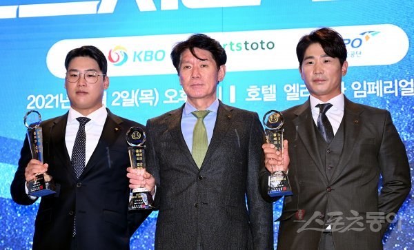 2일 서울 논현동 엘리에나호텔에서 열린 ‘스포츠서울 올해의 상’ 시상식에 참석한 KT 강백호, 이강철 감독, 박경수가 기념촬영을 하고 있다.