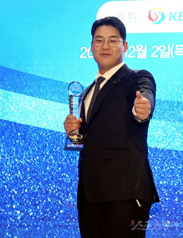 2일 서울 논현동 엘리에나호텔에서 열린 ‘스포츠서울 올해의 상’ 시상식에 참석한 KT 강백호가 올해의 선수를 수상한 뒤 기념촬영을 하고 있다.
