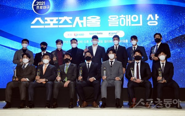 2일 서울 논현동 엘리에나호텔에서 열린 ‘스포츠서울 올해의 상’ 시상식에 참석한 수상자들이 기념촬영을 하고 있다.