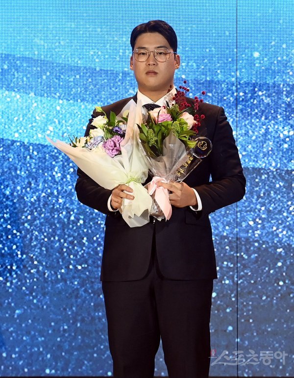 2일 서울 논현동 엘리에나호텔에서 열린 ‘스포츠서울 올해의 상’ 시상식에 참석한 KT 강백호가 올해의 선수를 수상한 뒤 기념촬영을 하고 있다.