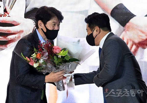 2일 서울 논현동 엘리에나호텔에서 열린 ‘스포츠서울 올해의 상’ 시상식에 참석한 KT 이강철 감독이 올해의 감독을 수상한 뒤 두산 김태형 감독의 축하를 받고 있다.