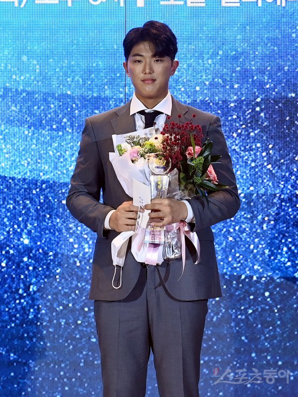2일 서울 논현동 엘리에나호텔에서 열린 ‘스포츠서울 올해의 상’ 시상식에 참석한 KIA 이의리가 올해의 신인을 수상한 뒤 기념촬영을 하고 있다.