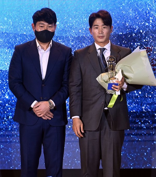 2일 서울 논현동 엘리에나호텔에서 열린 ‘스포츠서울 올해의 상’ 시상식에 참석한 KT 박경수가 올해의 수비를 수상한 뒤 양의지 선수협회장과 기념촬영을 하고 있다.