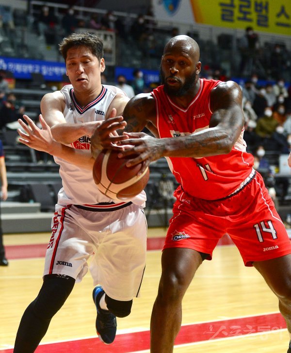2일 고양체육관에서 열린 ‘2021-2022 프로농구’ 고양 오리온과 울산 현대모비스 경기에서 현대모비스 함지훈과 오리온 할로웨이가 리바운드 볼을 다투고 있다.