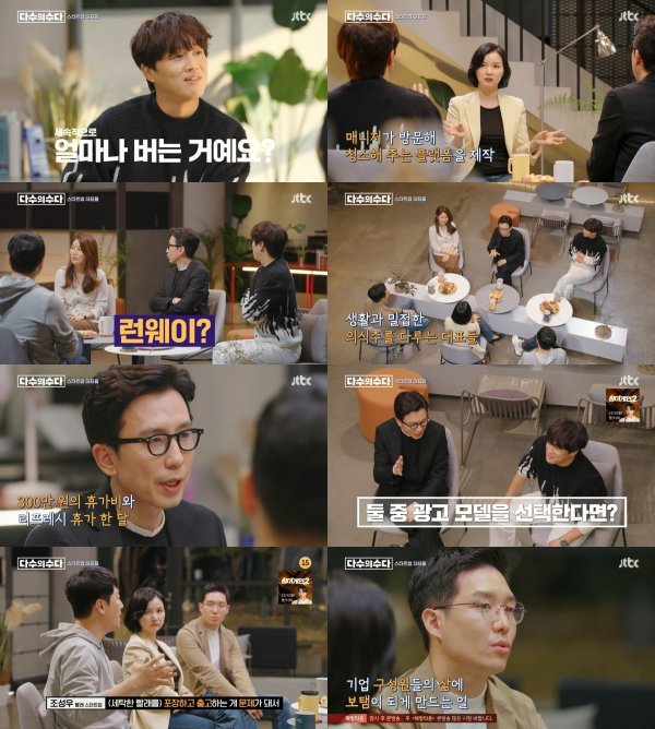 3일 방송된 JTBC '다수의 수다'에서는 생활에서 떼려야 뗄 수 없는 ‘의식주’와 관련된 스타트업 대표 4인과 대화를 나눴다. 청소, 빨래, 피자, 리모델링 스타트업을 운영 중인 대표들과 함께 안테나의 대표 유희열의 이야기를 들을 수 있어 관심을 모았다.
