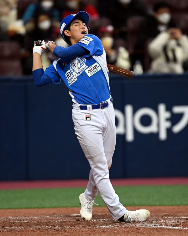 4일 서울 고척스카이돔에서 ‘2021 희망더하기 자선야구대회’가 열렸다. 종범신 이정후가 강백호의 타격을 따라하고 있다.