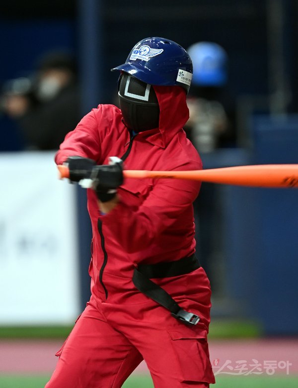 4일 서울 고척스카이돔에서 ‘2021 희망더하기 자선야구대회’가 열렸다. 양신 팀 원태인이 오징어게임 복장으로 타격을 펼치고 있다.
