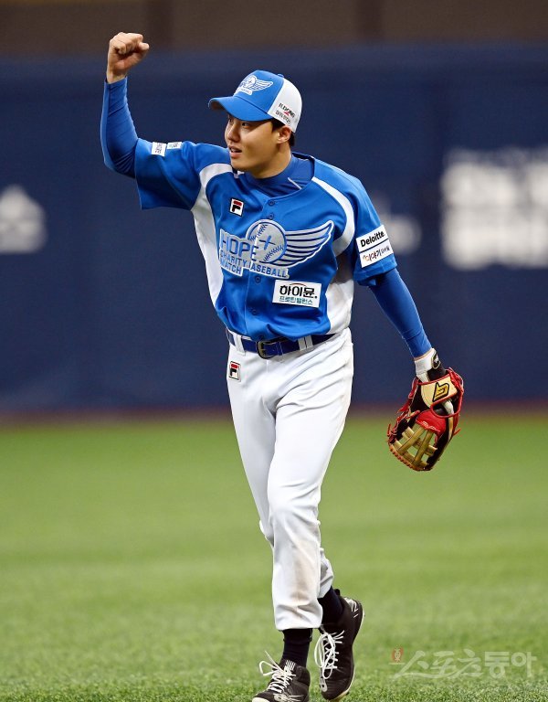 4일 서울 고척스카이돔에서 ‘2021 희망더하기 자선야구대회’가 열렸다. 종범신 임찬규가 호수비를 펼친 뒤 주먹을 쥐며 환호하고 있다.