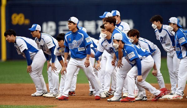 4일 서울 고척스카이돔에서 ‘2021 희망더하기 자선야구대회’가 열렸다. 양 팀 선수들이 오징어게임 속 ‘무궁화 꽃이 피었습니다’ 게임을 하고 있다.