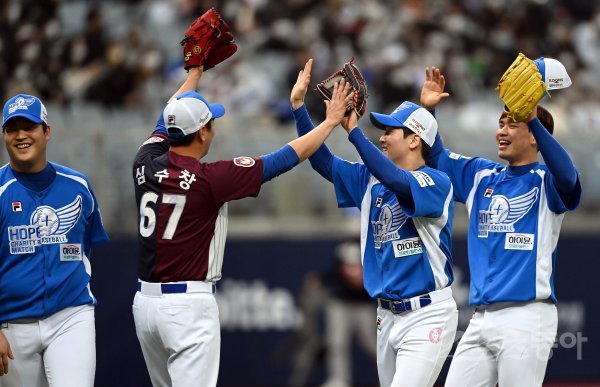 4일 서울 고척스카이돔에서 ‘2021 희망더하기 자선야구대회’가 열렸다. 종범신 팀이 승리한 뒤 선수들이 기쁨을 나누고 있다.