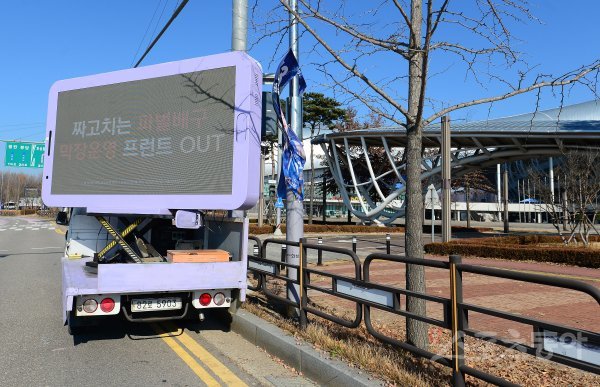 5일 화성종합체육관에서 ‘2021~2022 도드람 V-리그’ 여자부 IBK기업은행과 페퍼저축은행 경기가 열렸다. 배구 팬들이 조송화의 퇴출을 요구하는 트럭 시위를 하고 있다.