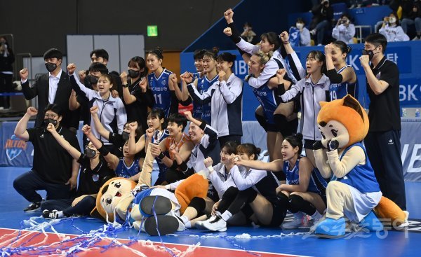 5일 화성종합체육관에서 열린 ‘2021~2022 도드람 V-리그’ 여자부 IBK기업은행과 페퍼저축은행 경기에서 3-0 완승을 거둔 IBK기업은행 선수들이 기념촬영을 하고 있다.