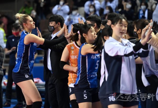 5일 화성종합체육관에서 열린 ‘2021~2022 도드람 V-리그’ 여자부 IBK기업은행과 페퍼저축은행 경기에서 3-0 완승을 거둔 IBK기업은행 안태영 감독대행이 선수들이 기뻐하고 있다.