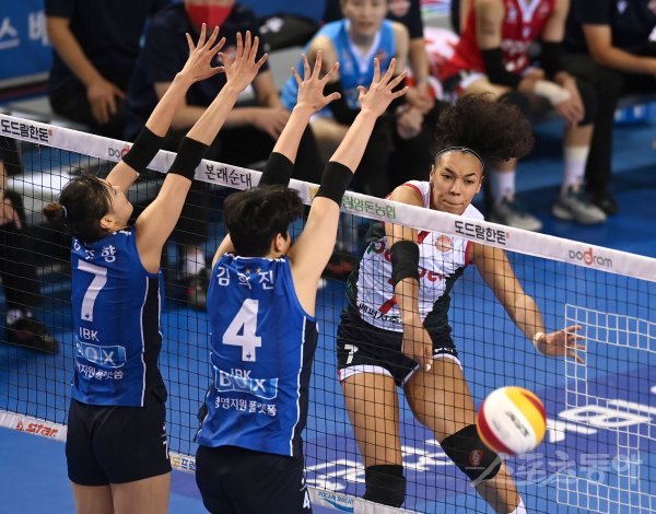 5일 화성종합체육관에서 열린 ‘2021~2022 도드람 V-리그’ 여자부 IBK기업은행과 페퍼저축은행 경기에서 페퍼저축은행 엘리자벳이 IBK기업은행의 블로킹 사이로 스파이크 공격을 하고 있다.