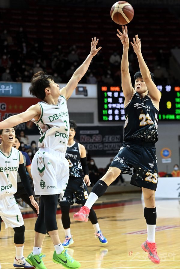 5일 경기도 안양실내체육관에서 열린 ‘2021-2022 정관장 프로농구’ 안양 KGC와 원주 DB의 경기에서 KGC 전성현이 DB 허웅의 수비를 앞에 두고 슛을 쏘고 있다.