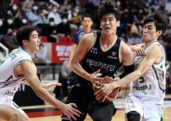 5일 경기도 안양실내체육관에서 열린 ‘2021-2022 정관장 프로농구’ 안양 KGC와 원주 DB의 경기에서 KGC 변준형이 DB 수비 사이로 돌파하고 있다.