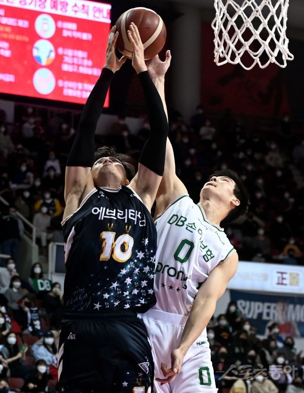 5일 경기도 안양실내체육관에서 열린 ‘2021-2022 정관장 프로농구’ 안양 KGC와 원주 DB의 경기에서 KGC 문성곤이 DB 타이치와 리바운드를 다투고 있다.