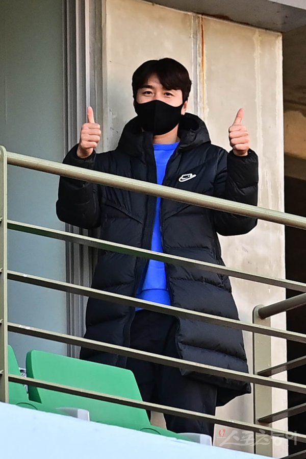 5일 전북 전주월드컵경기장에서 열린 ‘하나원큐 K리그1 2021’ 전북 현대와 제주 유나이티드의 경기에서 이동국이 취재진을 향해 엄지를 치켜세우고 있다.