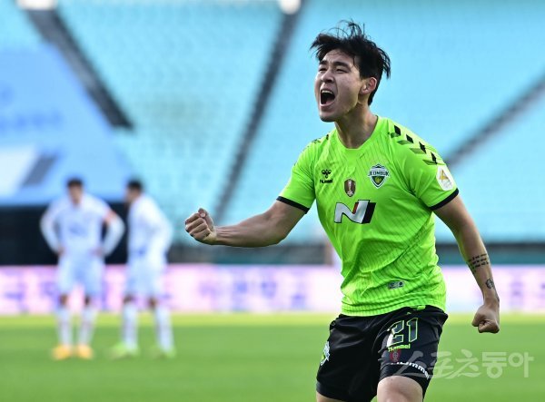 5일 전북 전주월드컵경기장에서 열린 ‘하나원큐 K리그1 2021’ 전북 현대와 제주 유나이티드의 경기에서 후반전에 전북 송민규가 추가골을 서옹시킨 후 세리머니를 하고 있다.