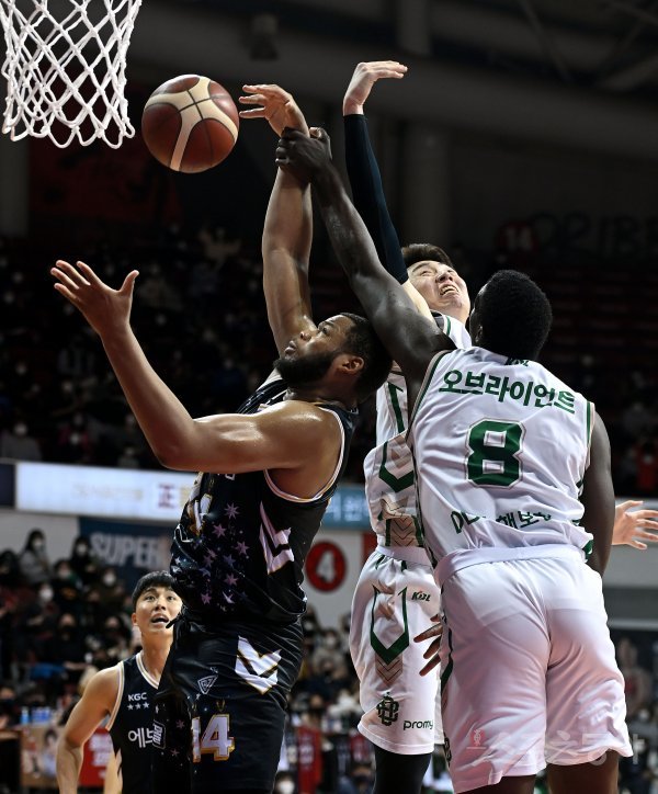 5일 경기도 안양실내체육관에서 열린 ‘2021-2022 정관장 프로농구’ 안양 KGC와 원주 DB의 경기에서 KGC 스펄맨이 리바운드를 잡아내고 있다.