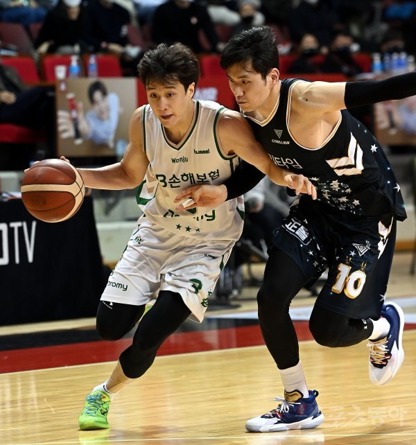 5일 경기도 안양실내체육관에서 열린 ‘2021-2022 정관장 프로농구’ 안양 KGC와 원주 DB의 경기에서 DB 허웅이 KGC 문성곤의 수비를 제치며 돌파를 시도하고 있다.