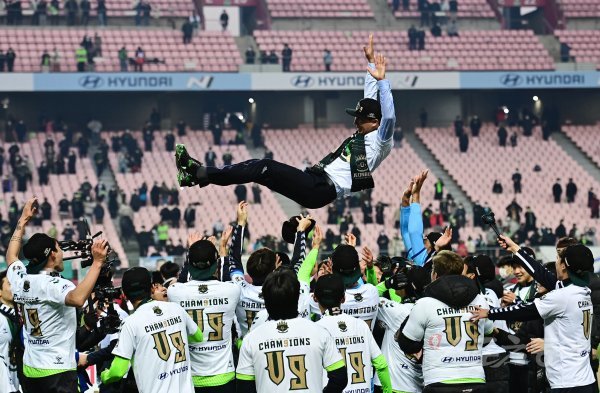 5일 전북 전주월드컵경기장에서 열린 ‘하나원큐 K리그1 2021’ 전북 현대와 제주 유나이티드의 경기에서 제주에 2-0으로 승리를 거둬 우승을 확정지은 전북 김상식 감독이 선수들에게 헹가래를 받고 있다.