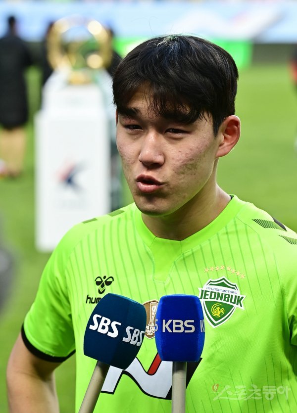 5일 전북 전주월드컵경기장에서 열린 ‘하나원큐 K리그1 2021’ 전북 현대와 제주 유나이티드의 경기에서 제주에 2-0으로 승리를 거둬 우승을 확정지은 전북 송민규가 방송사 인터뷰를 하고 있다.