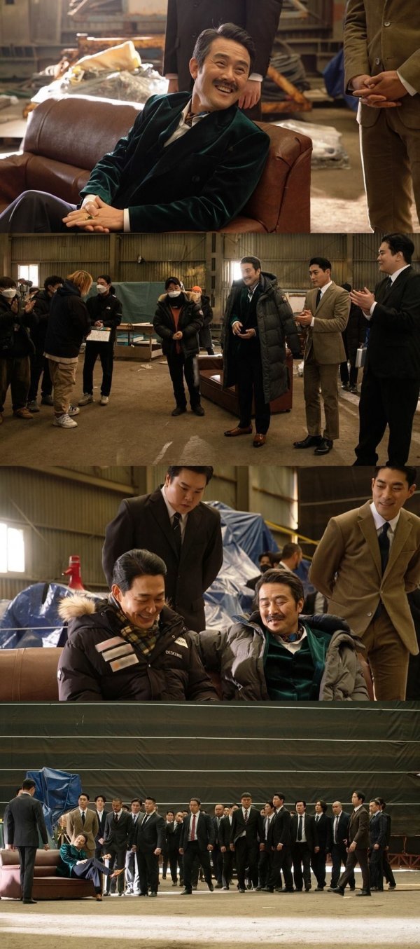 함께 극중 암흑가 보스 이정석을 연기하는 최민수의 촬영 재개와 함께 현장의 활기찬 분위기를 엿볼 수 있는 현장 사진이 공개됐다. 배우 박성웅 외 스태프들과 인사를 나누고 있는 모습이 담겼다.