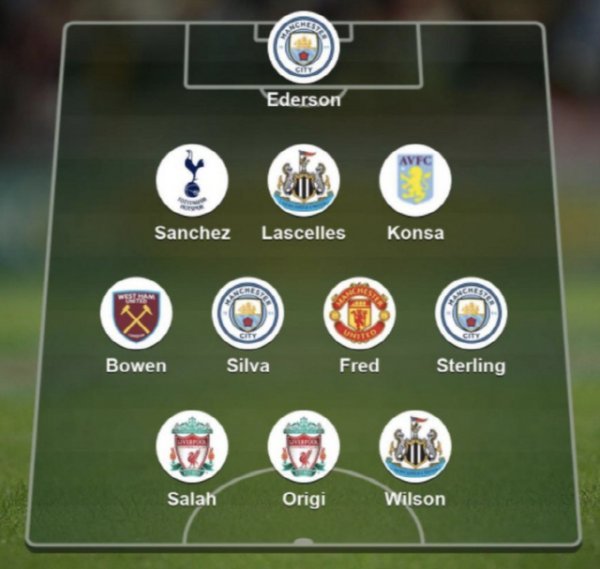 이어 미드필더 4명은 스털링(맨시티)-프레드(맨유)-베르나르두 실바(맨시티) 보웬(웨스트햄), 수비수 3명은 콘사(애스턴빌라)-라셀레스(뉴캐슬)-산체스(토트넘).