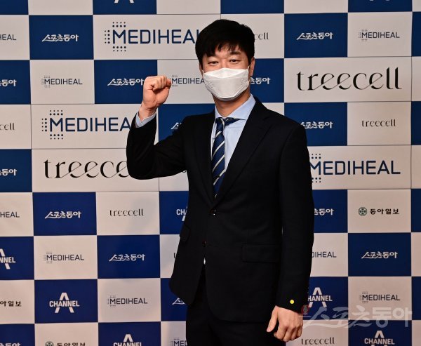 ‘감독 선임 후 첫 행보.’ KIA 김종국 신임 감독이 6일 서울 소공동 롯데호텔에서 열린 2021 동아스포츠대상 시상식에 참석해 기념촬영을 하고 있다. 5일 선임된 김 감독의 첫 공식석상이었다.