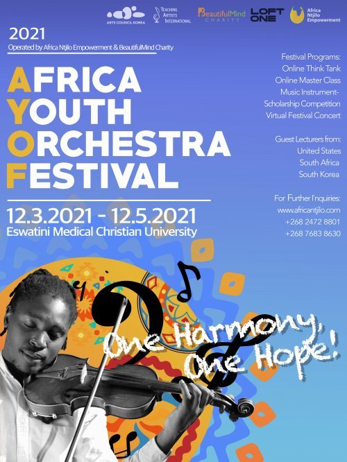 두 단체는 12월 3일부터 5일까지 3일간 ‘2021 아프리카 유스 오케스트라 페스티벌’을 공동 진행했다. 한국문화예술위원회가 후원하는 이번 페스티벌은 화상 온라인으로 진행됐으며 아프리카 에스와티니에서는 오프라인 행사도 병행됐다. 마지막 날인 5일의 피날레 음악회는 한국 및 해외 관객을 위해 랜선으로 진행했다. 페스티벌 기간에는 뷰티플마인드 뮤직아카데미에서 재능 기부를 통해 무료로 음악을 가르치는 국내 대학교수급 전문 강사진이 아프리카 아이들에게 온라인 소규모 그룹 레슨, 마스터클래스, 워크숍 등을 진행하는 형태로 개최됐다.