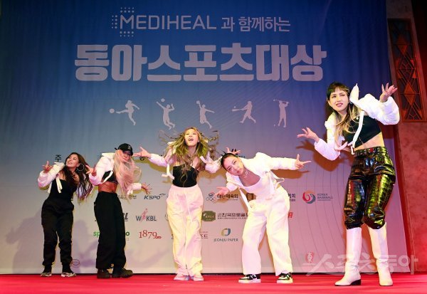 스포츠동아가 동아일보, 채널A, 메디힐과 공동으로 주최하고 국내 5대 프로스포츠(프로야구·프로축구·남녀프로농구·남녀프로배구·남녀프로골프) 종목별로 올 한해를 빛낸 최고의 선수를 선정하는‘메디힐과 함께하는 2021 동아스포츠대상‘ 시상식이 6일 서울 중구 롯데호텔서울 크리스탈볼룸에서 개최됐다. 스프릿 우먼 파이터에 출연한 라치카가 축하공연을 펼치고 있다.