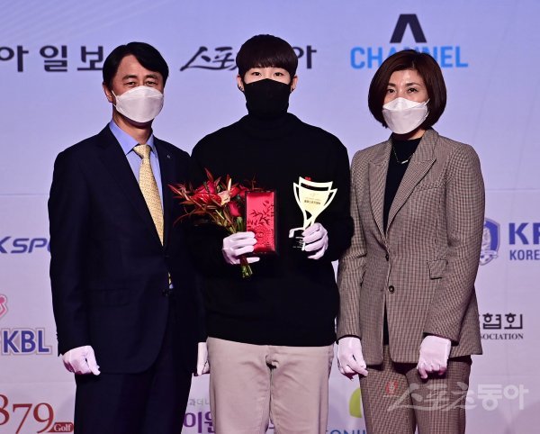 6일 서울 중구 롯데호텔서울에서 열린 ‘MEDIHEAL과 함께하는 2021 동아스포츠대상‘ 시상식에서 여자프로배구 올해의 선수상을 수상한 KGC 인삼공사 이소영(가운데)이 신무철 한국배구연맹 사무총장(왼쪽), 장윤희 중앙여고 감독과 기념촬영을 하고 있다.‘MEDIHEAL과 함께하는 2021 동아스포츠대상’은 스포츠동아가 동아일보, 채널A, MEDIHEAL(메디힐)과 공동으로 주최하고 국내 5대 프로스포츠(프로야구·프로축구·남녀프로농구·남녀프로배구·남녀프로골프) 종목별로 올 한해를 빛낸 최고의 선수를 선수들이 직접투표로 선정하는 국내 유일의 시상식이다.