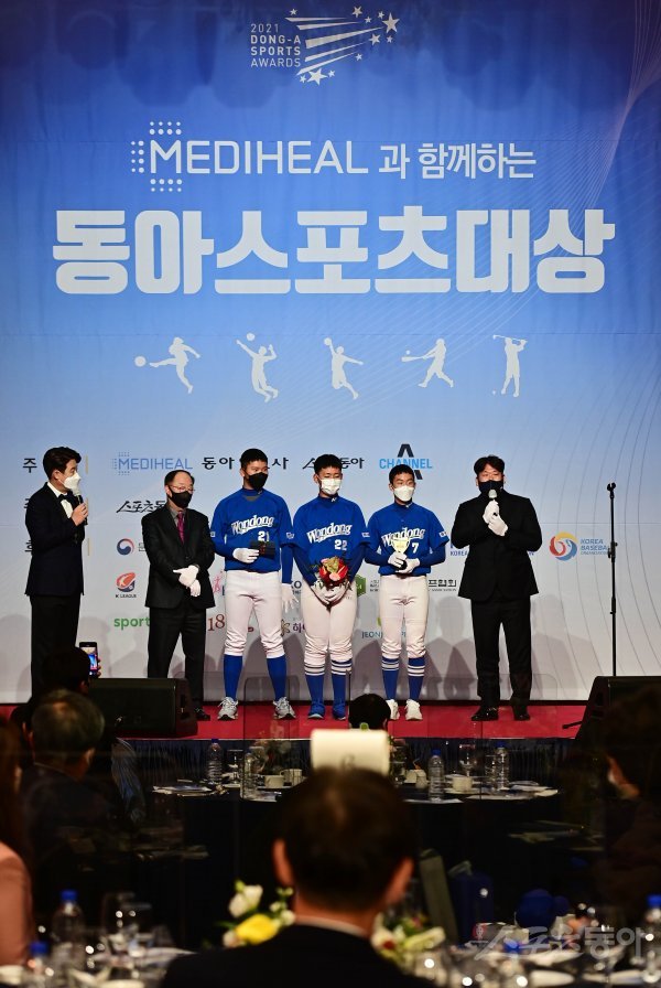 6일 서울 중구 롯데호텔서울에서 열린 ‘MEDIHEAL과 함께하는 2021 동아스포츠대상‘ 시상식에서 메디힐 특별상을 수상한 원동중학교 드림야구단이 소감을 말하고 있다.‘MEDIHEAL과 함께하는 2021 동아스포츠대상’은 스포츠동아가 동아일보, 채널A, MEDIHEAL(메디힐)과 공동으로 주최하고 국내 5대 프로스포츠(프로야구·프로축구·남녀프로농구·남녀프로배구·남녀프로골프) 종목별로 올 한해를 빛낸 최고의 선수를 선수들이 직접투표로 선정하는 국내 유일의 시상식이다.