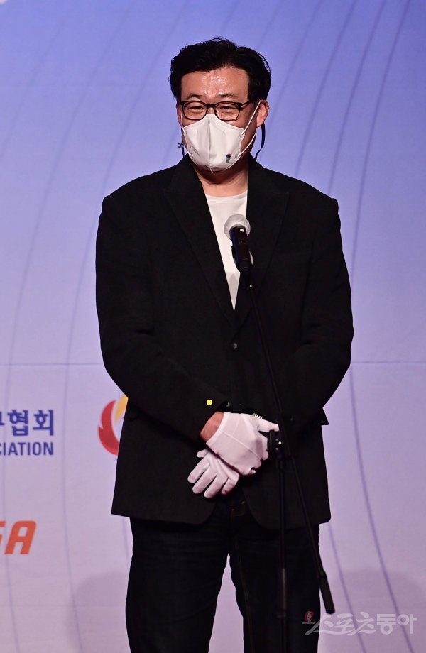 6일 서울 중구 롯데호텔서울에서 열린 ‘MEDIHEAL과 함께하는 2021 동아스포츠대상‘ 시상식에서 여자프로농구 올해의 선수상을 수상한 청주 KB스타즈 박지수를 대신해 아버지 박상관 씨가 소감을 전하고 있다.‘MEDIHEAL과 함께하는 2021 동아스포츠대상’은 스포츠동아가 동아일보, 채널A, MEDIHEAL(메디힐)과 공동으로 주최하고 국내 5대 프로스포츠(프로야구·프로축구·남녀프로농구·남녀프로배구·남녀프로골프) 종목별로 올 한해를 빛낸 최고의 선수를 선수들이 직접투표로 선정하는 국내 유일의 시상식이다.