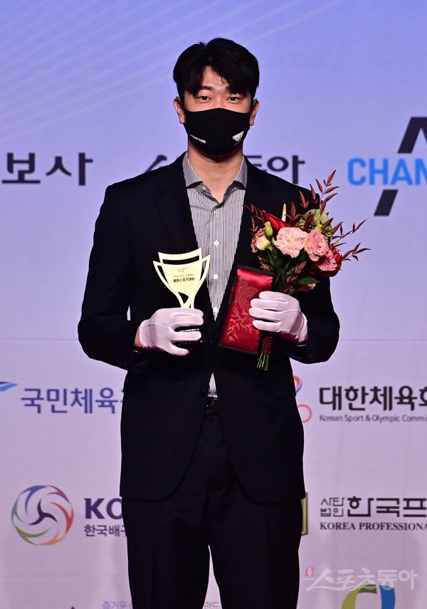 6일 서울 중구 롯데호텔서울에서 열린 ‘MEDIHEAL과 함께하는 2021 동아스포츠대상‘ 시상식에서 남자프로배구 올해의 선수상을 수상한 우리카드 나경복이 기념촬영을 하고 있다.‘MEDIHEAL과 함께하는 2021 동아스포츠대상’은 스포츠동아가 동아일보, 채널A, MEDIHEAL(메디힐)과 공동으로 주최하고 국내 5대 프로스포츠(프로야구·프로축구·남녀프로농구·남녀프로배구·남녀프로골프) 종목별로 올 한해를 빛낸 최고의 선수를 선수들이 직접투표로 선정하는 국내 유일의 시상식이다.