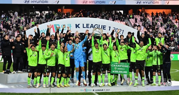 5일 전북 전주월드컵경기장에서 열린 ‘하나원큐 K리그1 2021’ 전북 현대와 제주 유나이티드의 경기에서 제주에 2-0으로 승리를 거둬 우승을 확정지은 전북 선수들이 우승 트로피를 들고 세리머니를 하고 있다. 전주 | 주현희 기자 teth1147@donga.com