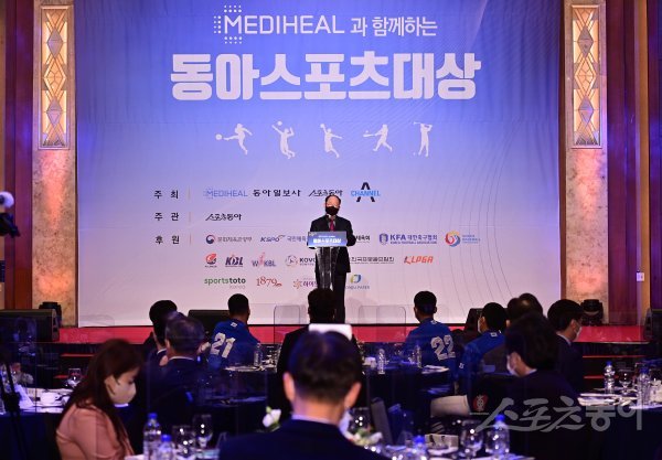 6일 서울 중구 롯데호텔서울에서 열린 ‘MEDIHEAL과 함께하는 2021 동아스포츠대상‘ 시상식에서 권오섭 메디힐 회장이 환영사를 하고 있다.‘MEDIHEAL과 함께하는 2021 동아스포츠대상’은 스포츠동아가 동아일보, 채널A, MEDIHEAL(메디힐)과 공동으로 주최하고 국내 5대 프로스포츠(프로야구·프로축구·남녀프로농구·남녀프로배구·남녀프로골프) 종목별로 올 한해를 빛낸 최고의 선수를 선수들이 직접투표로 선정하는 국내 유일의 시상식이다.