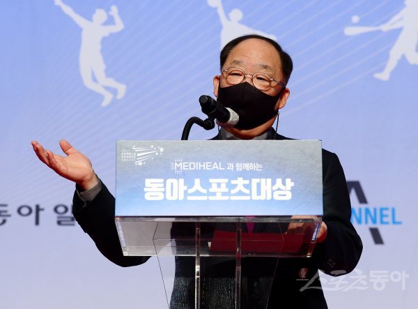 ‘메디힐과 함께하는 2021 동아스포츠대상‘ 시상식이 6일 서울 중구 롯데호텔서울 크리스탈볼룸에서 개최됐다. 권오섭 메디힐 회장이 환영사를 밝히고 있다. 김민성 기자 marineboy@donga.com