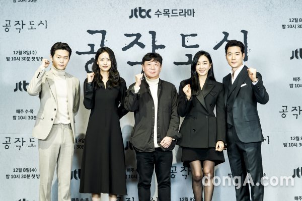 이학주, 이이담, 전창근 감독, 수애, 김강우(왼쪽부터)가 8일 오후 온라인으로 진행된 JTBC 새 수목드라마 ‘공작도시’ 제작발표회에 참석, 포즈를 취하고 있다.