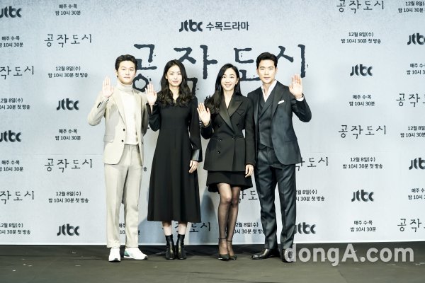 배우 이학주, 이이담, 수애, 김강우(왼쪽부터)가 8일 오후 온라인으로 진행된 JTBC 새 수목드라마 ‘공작도시’ 제작발표회에 참석, 포즈를 취하고 있다.