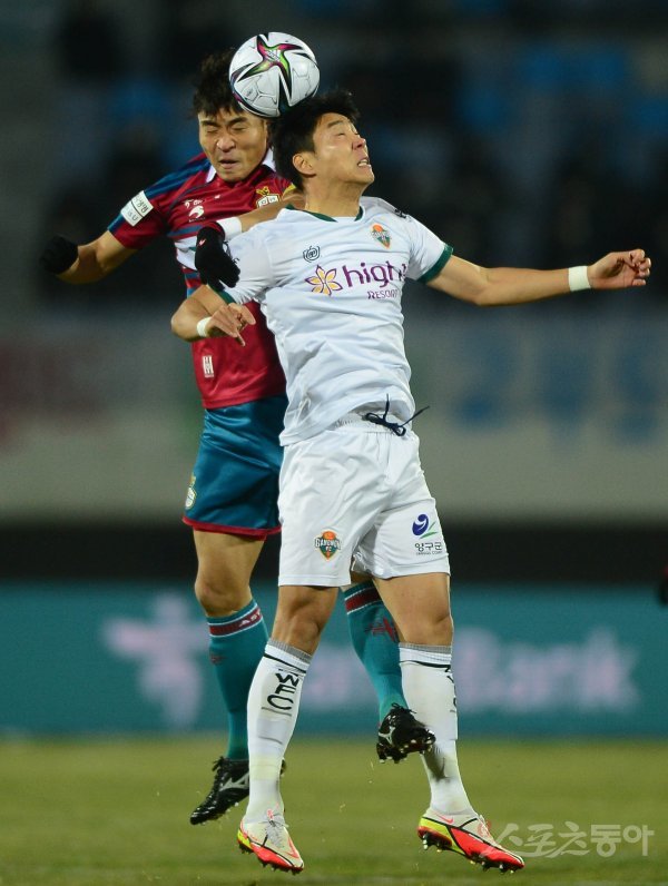 8일 대전 한밭종합운동장에서 열린 ‘하나원큐 K리그 승강 플레이오프 2021’ 1차전 대전 하나시티즌과 강원FC의 경기에서 대전 박진섭과 강원 이정협이 헤딩 경합을 벌이고 있다.