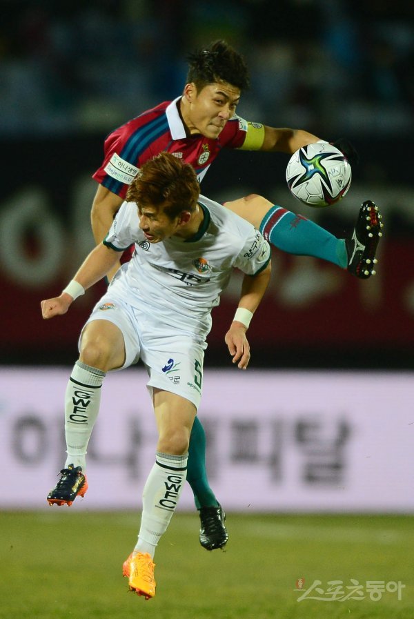 8일 대전 한밭종합운동장에서 열린 ‘하나원큐 K리그 승강 플레이오프 2021’ 1차전 대전 하나시티즌과 강원FC의 경기에서 대전 박진섭이 강원 정승용과 헤딩 경합을 하고 있다.