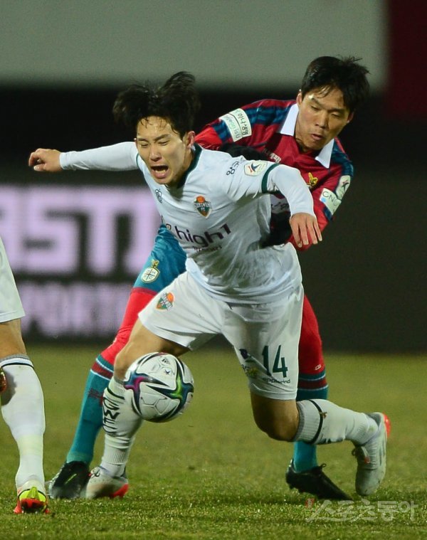 8일 대전 한밭종합운동장에서 열린 ‘하나원큐 K리그 승강 플레이오프 2021’ 1차전 대전 하나시티즌과 강원FC의 경기에서 강원 신창무가 대전 이종현에게 반칙을 당하고 있다.