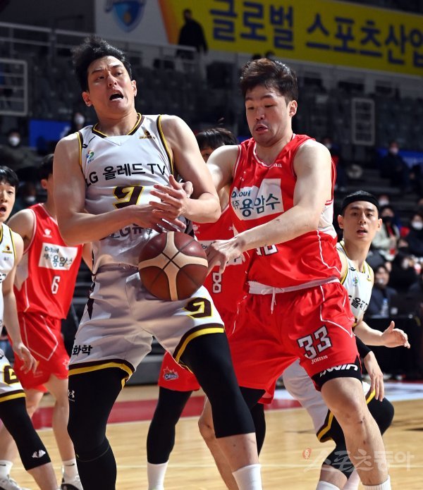 8일 경기도 고양체육관에서 열린 ‘2021-2022 프로농구’ 고양 오리온과 창원 LG 경기에서 LG 정희재와 오리온 이승현이 리바운드 볼을 다투고 있다.