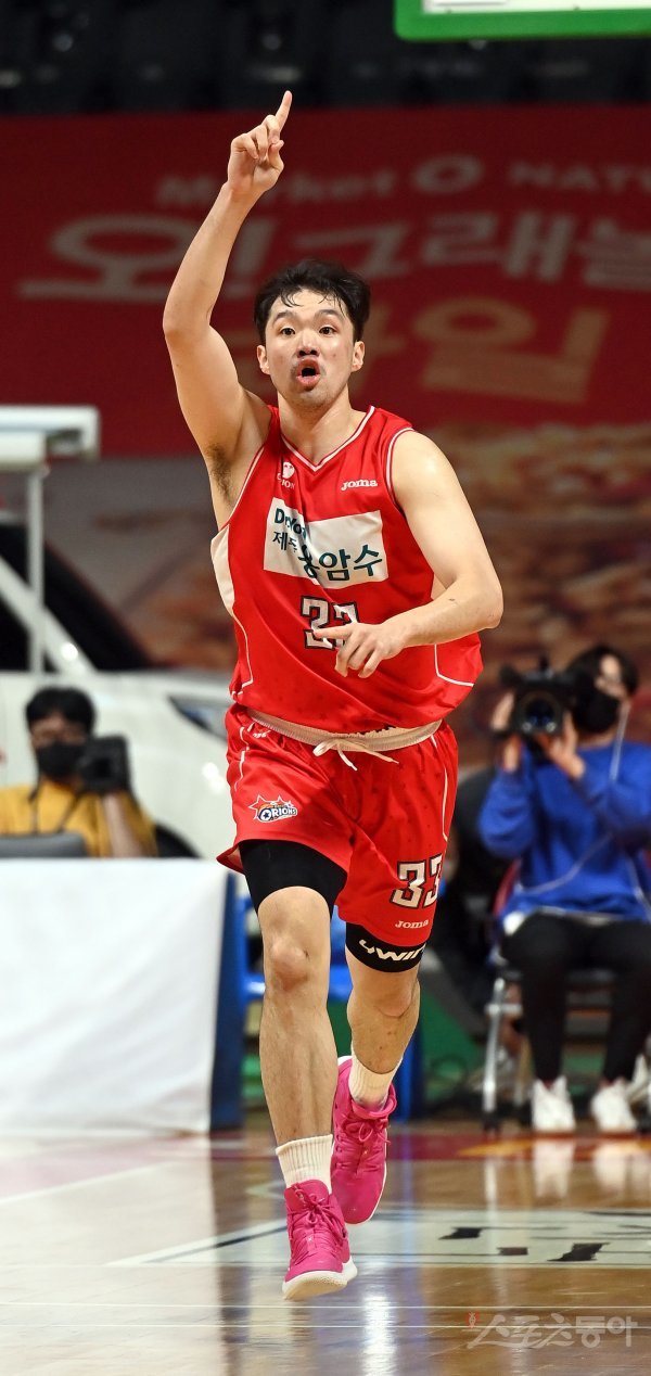 8일 경기도 고양체육관에서 열린 ‘2021-2022 프로농구’ 고양 오리온과 창원 LG 경기에서 오리온 이승현이 득점에 성공한 후 기뻐하고 있다.